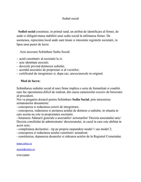 vizitati articolul complet aici : https://ro.scribd.com/doc/216081485/Etape-Infiintare-Firma Acordul vecinilor se obtine atunci cand punctul de lucru se deschide in cadrul unui condominiu care are ca forma de organizare o asociatie de proprietari. Para poder acceder al servicio es necesario que los datos que se le solicitan en este formulario coincidan exactamente con los registrados en la base de datos de la seguridad social. 0 ratings0% found this document useful (0 votes).
